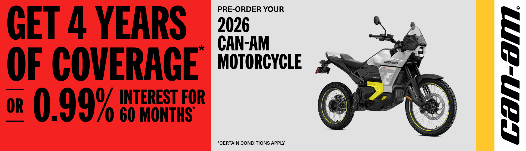 Pre-order a 2026 Can-Am motorcycle and get 4 years of coverage or financing starting at 0.99% for 60 months