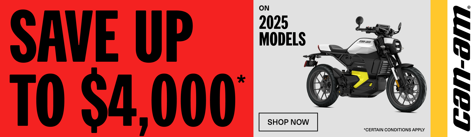 † Get up to a $4,000 rebate on select 2025 Can-Am motorcycle models: Consumers who purchase a Can-Am Pulse or Origin 2025 are eligible to a $4,000 rebate.