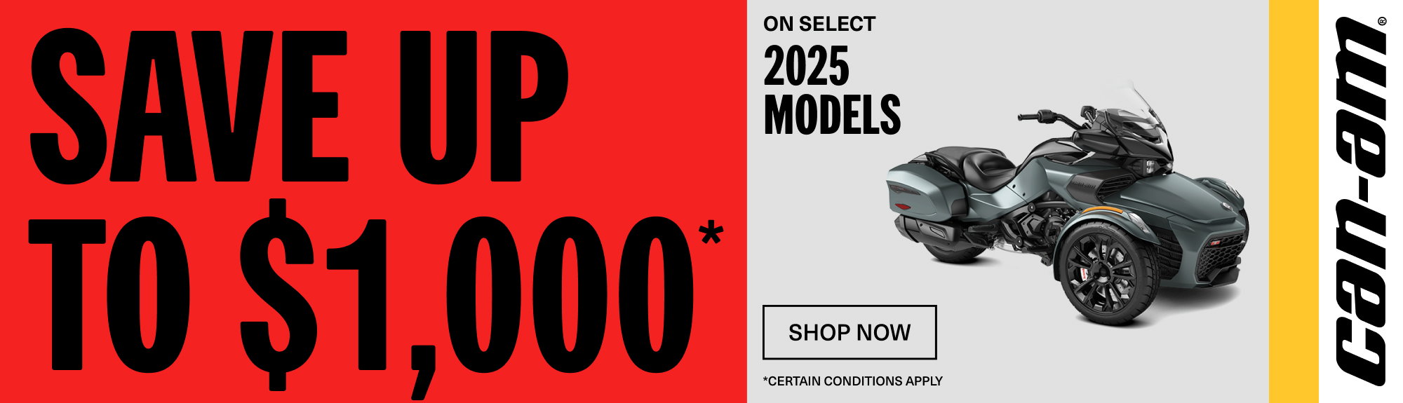 ©2025 Bombardier Recreational Products Inc. (BRP). All rights reserved. ®, ™ and the BRP logo are trademarks of BRP or its affiliates. In the U.S.A., products are distributed by BRP US Inc. Offers valid in U.S.A. only between November 1, 2025 - January 31, 2026. The conditions may vary depending on your location and this offer is subject to termination or change at any time without notice. This offer is not refundable, exchangeable or transferable (including from one dealership to another), cannot be redeemed for cash, credit or other products of equivalent value. Null where prohibited by law. Until supplies last. Eligible units are all new and unused 2024 Can-Am 3-Wheels models. Other Can-Am On-Road models may qualify for other promotions, see local dealers for details.